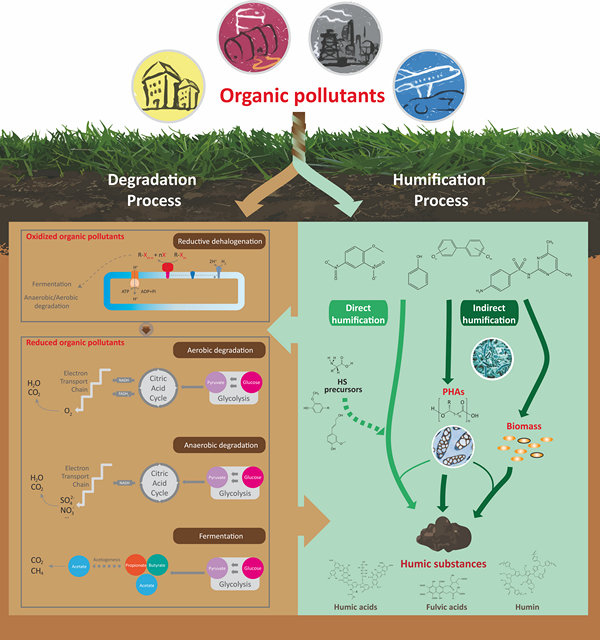 自然环境中有机污染物降解与腐殖化过程示意图